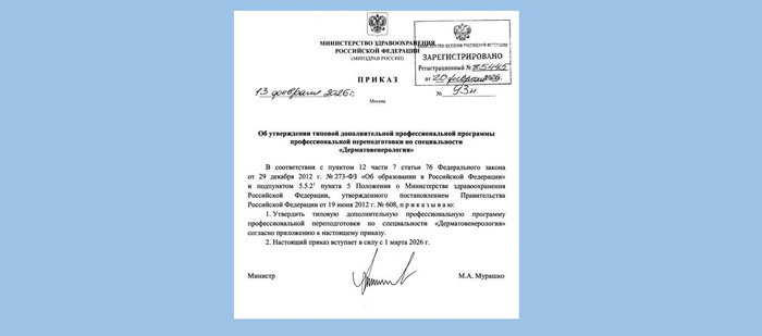 Утверждена типовая дополнительная профессиональная программа профессиональной переподготовки по специальности «Дерматовенерология»