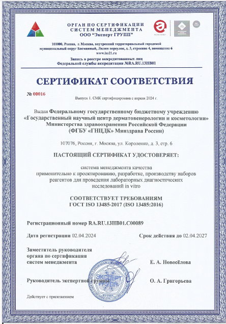 Орган по сертификации систем менеджмента ООО «Эксперт ГРУПП» осуществил ежегодный инспекционный контроль системы менеджмента качества ФГБУ «ГНЦДК» Минздрава России на соответствие требованиям ГОСТ ISO 13485-2017 (ISO 13485:2016) применительно проектированию, разработке и производству наборов реагентов для проведения лабораторных диагностических исследований in vitro.