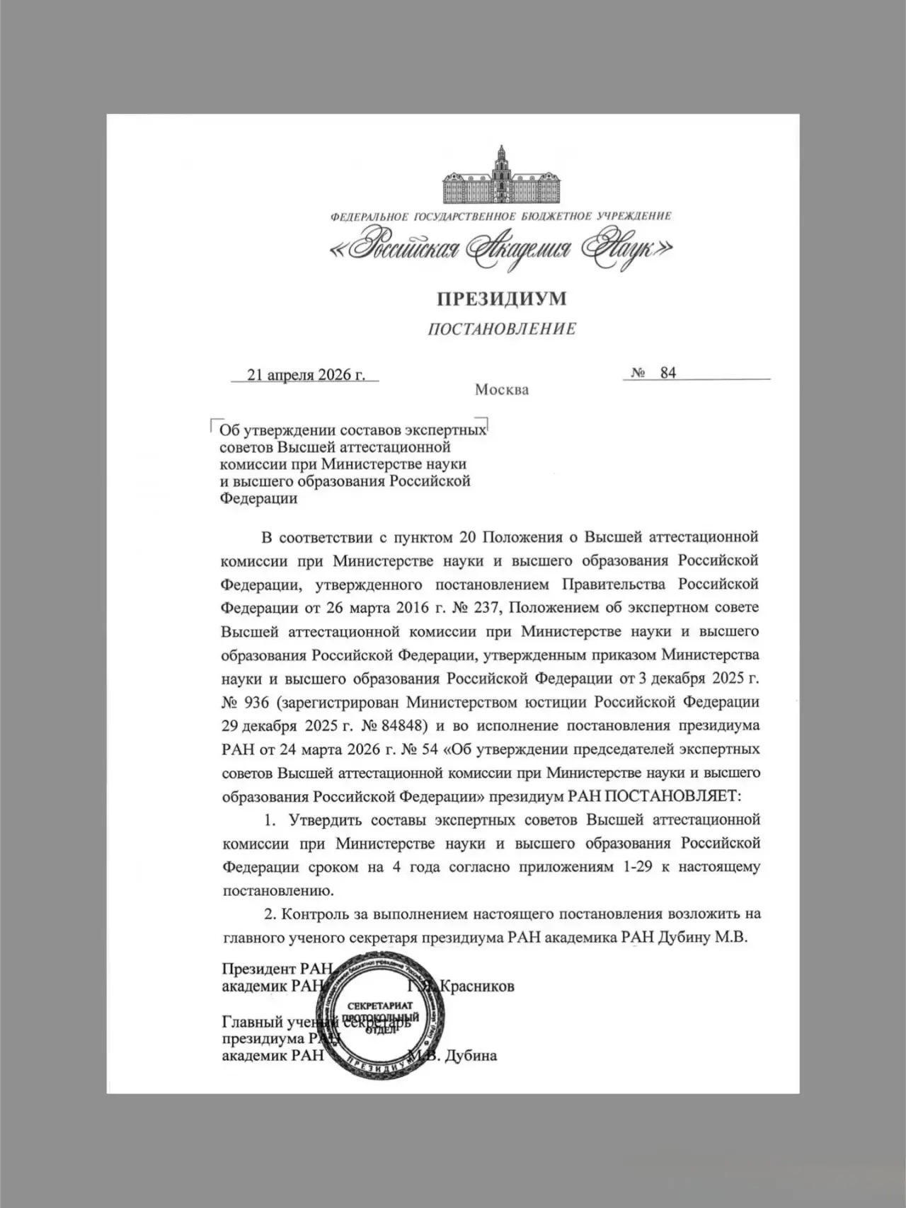 Постановлением Президиума Российской академии наук утверждены новые составы экспертных советов ВАК сроком на 4 года